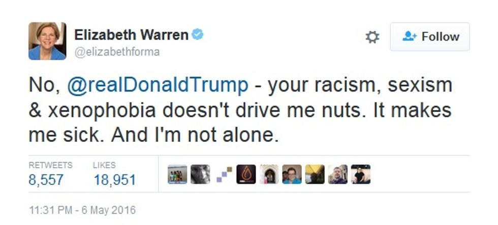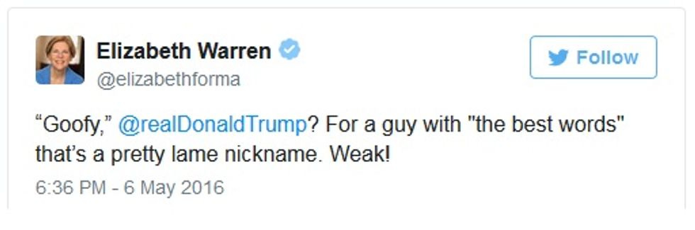 Massachusetts nerd goddess Sen. Elizabeth Warren does not suffer fools gladly. There's one particular fool she has very little patience for: the presumptive Republican nominee. Tuesday night, Warren tweeted out a glorious stream of invective against Donald Trump, vowing she would do everything possible to ensure his "toxic stew of hatred & insecurity never reaches the White House." That prompted famous Twitter stud and non-office-holder Scott "Bqhatevwr" Brown to wonder if she'd been drunk tweeting, which was good for a laugh. Trump himself apparently only noticed her tweetstorm Friday, when he sent out a couple of tweets with his characteristically whimsical wit: