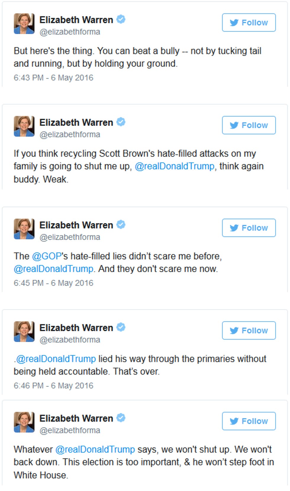 Oh, Donnie. You are, as they say, out of your league. Let's just say Warren was not gentle in her replies. For starters, she appears to feel slighted by just how lazy Trump had been in trying to insult her. Bonus points for her Trump-style closing: