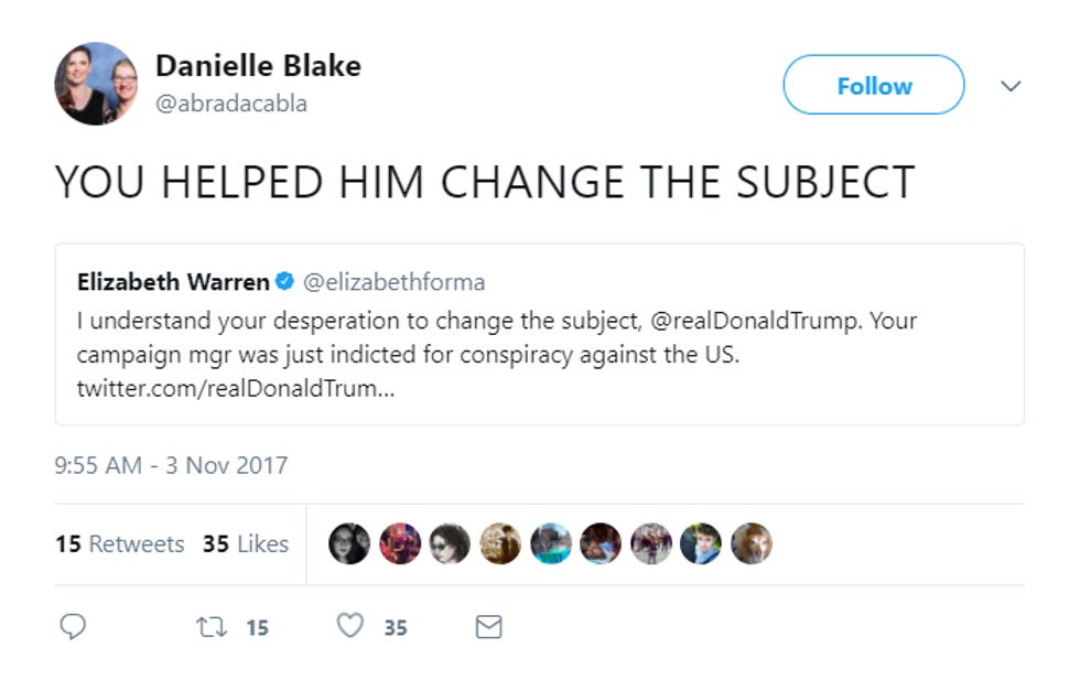 But regardless, MISSION ACCOMPLISHED, Donna Brazile and Elizabeth Warren (whom we love! Brazile, meh, not so sure right now). Any other ways you'd like to help President Pussgrab divide and conquer and consolidate power?