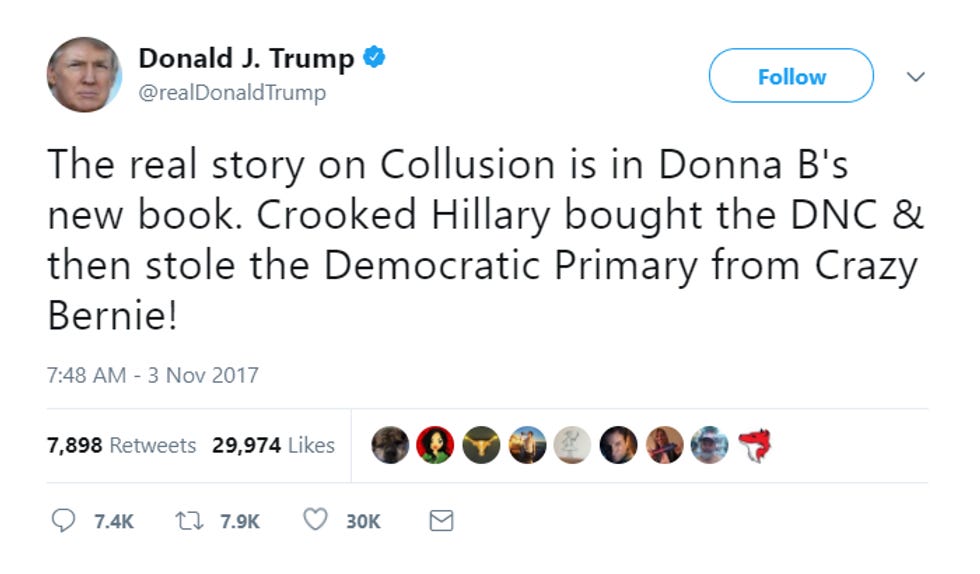 The messages from Warren and Brazile were heard loud and clear by the Training Wheels Despot in the White House, though, who immediately seized on the grievances of (SOME, NOT ALL) Bernie Sanders supporters who believe the primary was #RIGGED: