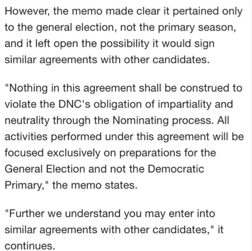 What people seem to be mad about is that it's somehow unfair that Hillary Clinton used the current fundraising system we have, and as a result, reached MORE VOTERS with her message. Bernie Sanders had that system available to him (the EXACT SAME joint fundraising agreement Hillary had, actually), and he elected not to use it. This is an important point, so we will say it again: Bernie Sanders was availed of the EXACT SAME OPPORTUNITIES Hillary Clinton had, but he chose to do it his own way. And that is fine! And it's not anti-Bernie to state that fact! Want to read the DNC memo about the agreements? Because it was just published. . And since we don't trust everyone to click on that link and read it, HERE'S A SCREENGRAB. Read and watch Donna Brazile's story fall apart before your eyes!