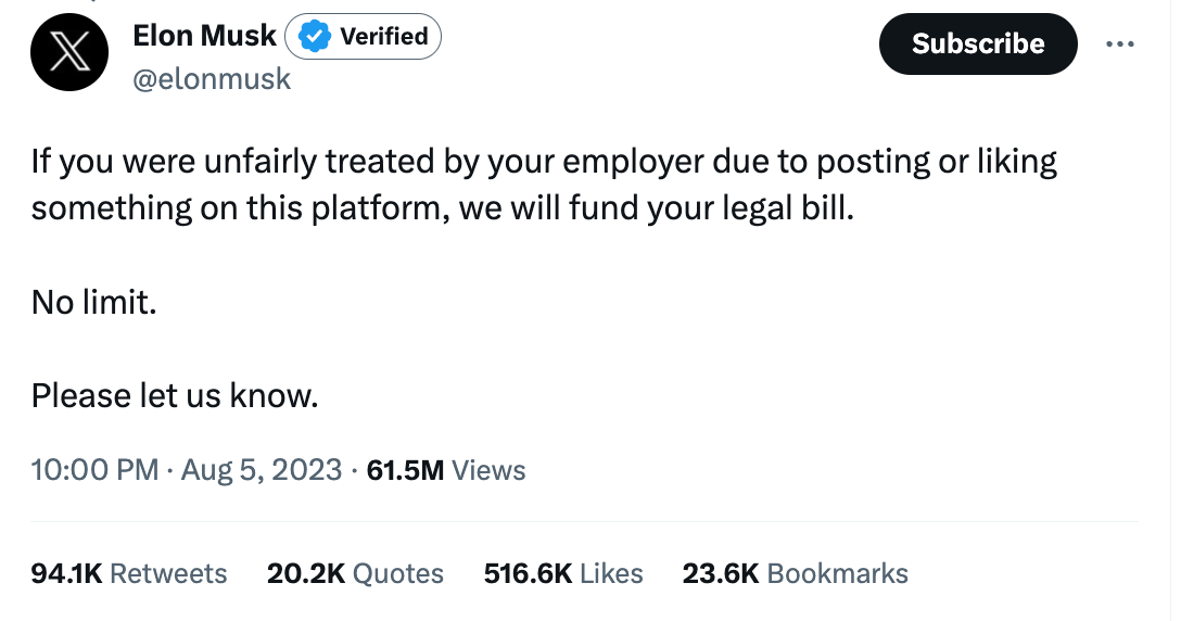 “If you were unfairly treated by your employer due to posting or liking something on this platform, we will fund your legal bill,” he wrote. “No limit. Please let us know.”