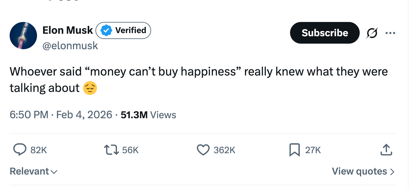 Alas, as it turns out, the one who is really sad … is Elon Musk himself! Because by nearly 7pm the next day, he was kvetching about how his money hasn’t bought him happiness. Apparently being a misogynistic racist prick hasn’t done the trick, either!