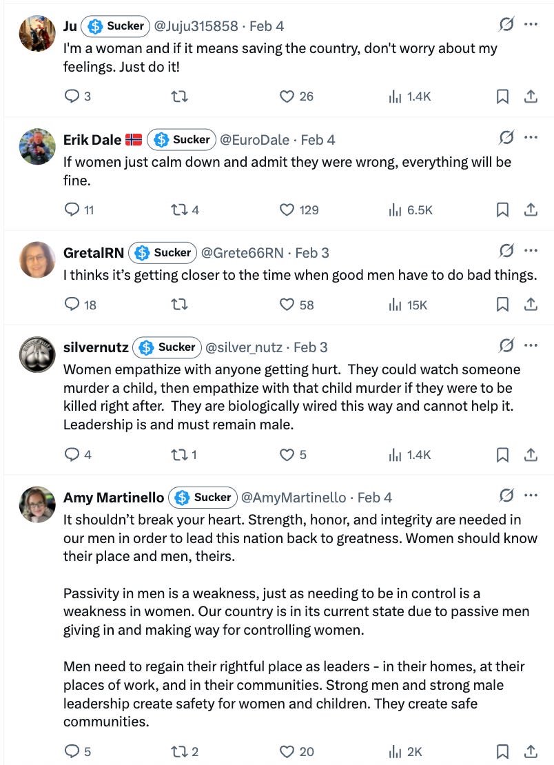 “It breaks my heart to say but in order to save this country we are probably going to have to do things that make women sad :(,” tweeted a user calling themselves PubWanghaf (WANGHAF being a popular meme among Groypers meaning “White Ass N-words Going Hard As Fuck.”)