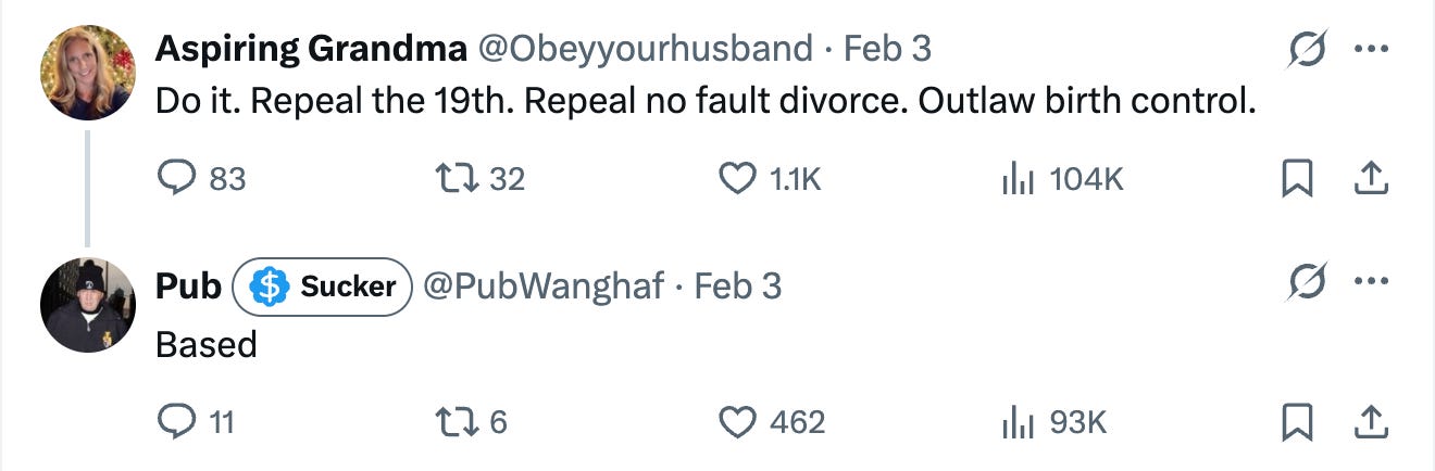 While the user was not specific about what he thought this would entail, it’s not hard to guess. Particularly since he responded so very enthusiastically to women who responded by saying they’d love to give up their right to vote.