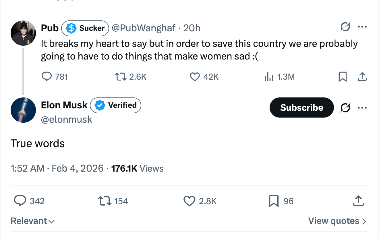 Elon Musk Agrees: 'Saving' The Country Will Require Doing Things 'That Make Women Sad.'