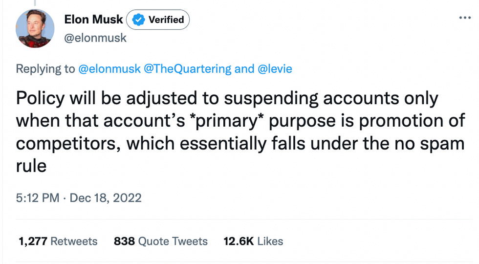 After spending most of the day at the World Cup with Jared Kushner and a bunch of Saudis, Musk took to Twitter to defend the policy in the responses to a tweet from noted right-wing chud and resident of Malaysia Ian Miles Cheong. He explained that the policy was to prevent "relentless free advertising of competitors," claiming that "[n]o traditional publisher allows this and neither will Twitter."