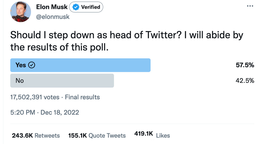 Following urging from video game developer and former congressional candidate Brianna Wu and others, Musk put up a poll on Sunday night asking Twitter users if they wanted him to step down as leader of Twitter and put someone else in charge (a move Tesla stockholders would surely appreciate), promising to abide by whatever the results are.