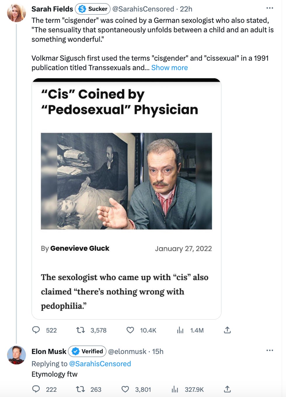 Musk then tweeted "Etymology FTW" at someone who claimed that the man who invented the term cisgender was a pedophile, as if this would somehow invalidate it. This would also potentially invalidate several words invented by Lewis Carroll, who himself has been accused of being a pedophile (though this has never actually been confirmed and is frequently disputed) — including chortle, snark and galumph.