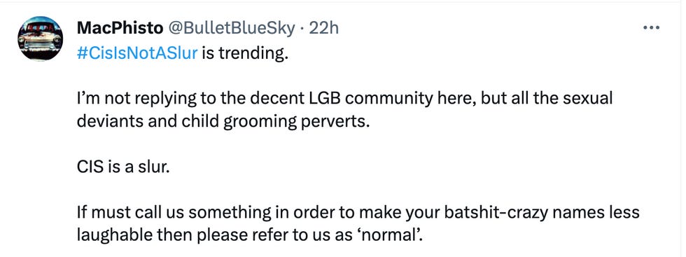 On Wednesday, Musk soothed the bruised soul of a man whose presence on the social media site seems to be dedicated solely to expressing his anger over the fact that trans people exist by telling him that, from now on, the terms cis and cisgender will be considered "slurs."