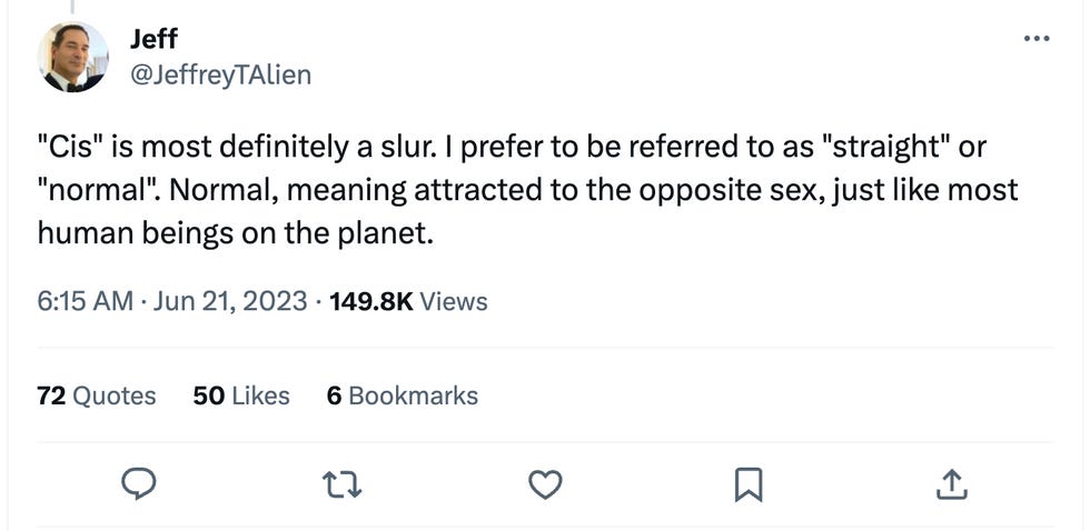 There is no reason for anyone to be upset by the terms "cis" or "cisgender." It literally just means that your gender corresponds to the gender you were assigned at birth. It's not a big deal to anyone except those who feel importantly about being able to exclude others. Some transphobes with less guile than Musk made this clear with tweets about how they don't want to be called "cis" or "cisgender" — they want to be called normal . And for those who are different from them to be called ab normal.