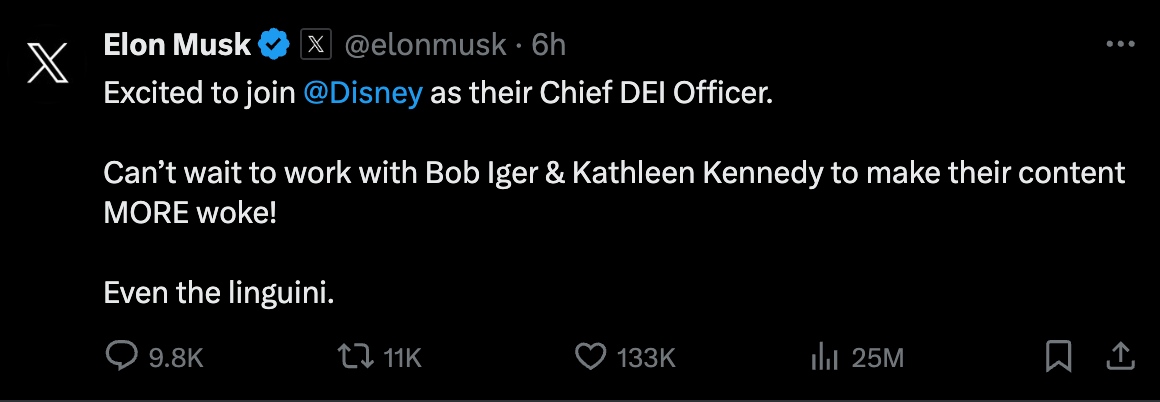 “Excited to join Disney as their Chief DEI Officer,” tweeted Elon, on Twitter, because “DEI” is a thing normal people make fun of and talk about all the time.