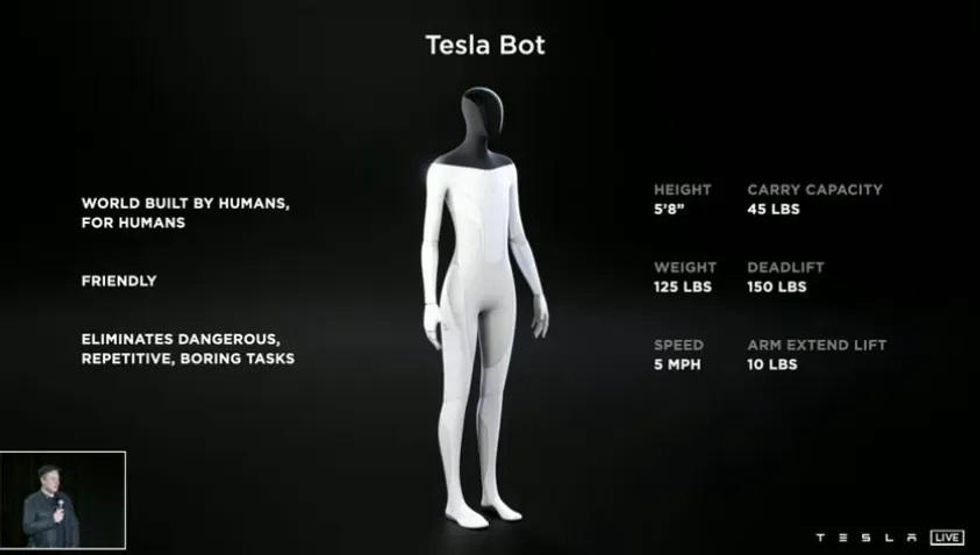 Tesla and SpaceX CEO Elon Musk announced Thursday that Tesla will develop humanoid robots based on the artificial intelligence and sensor technology that's also going into its cars, with the aim of producing friendly robots that will perform repetitive simple tasks, freeing humans to do more fulfilling things like argue on Twitter all day. Since no actual prototype exists, Musk began the presentation at "Tesla AI Day" by having a dude in a robot-looking unitard dance around on stage to techno music, to demonstrate the range of motion that the human body has, and that the eventual Tesla Bot may or may not clumsily approximate.