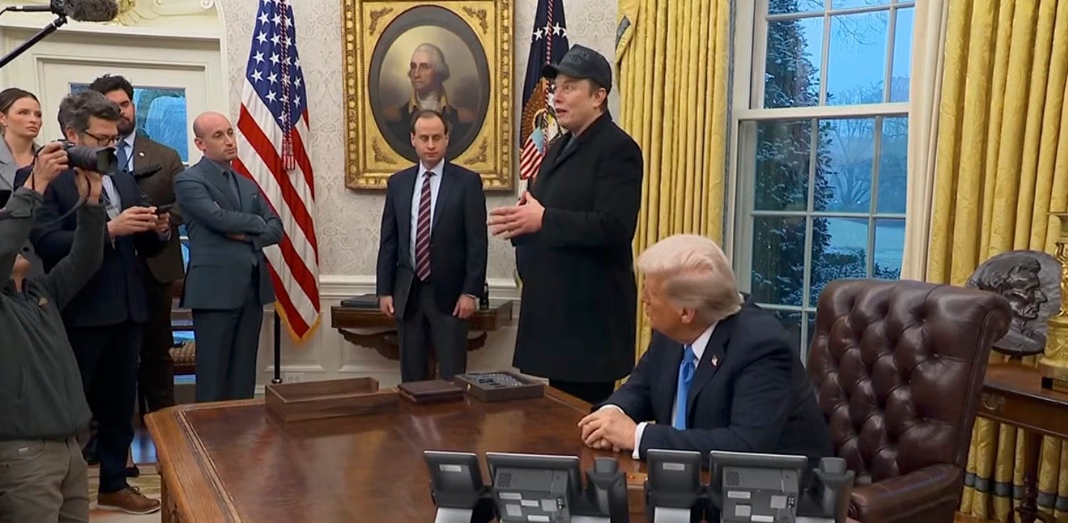 Er, okay, so who is managing these people who are deleting everything then? (And who is paying them?) And if Musk has no power, why does anybody but Poppy Trump have to listen to him or let his flunkies in the building, or let them look at classified information? Why does he keep saying “we” when he twits about DOGE, and why did Trump ask him in that awkward press conference to “mention some of the things your team has found?”