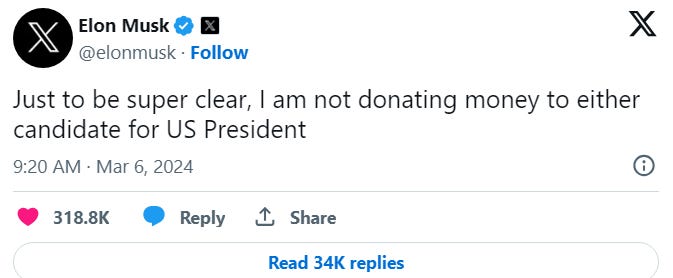 Elon says he's not donating money to 'either candidate,' but thems could be weasel words.