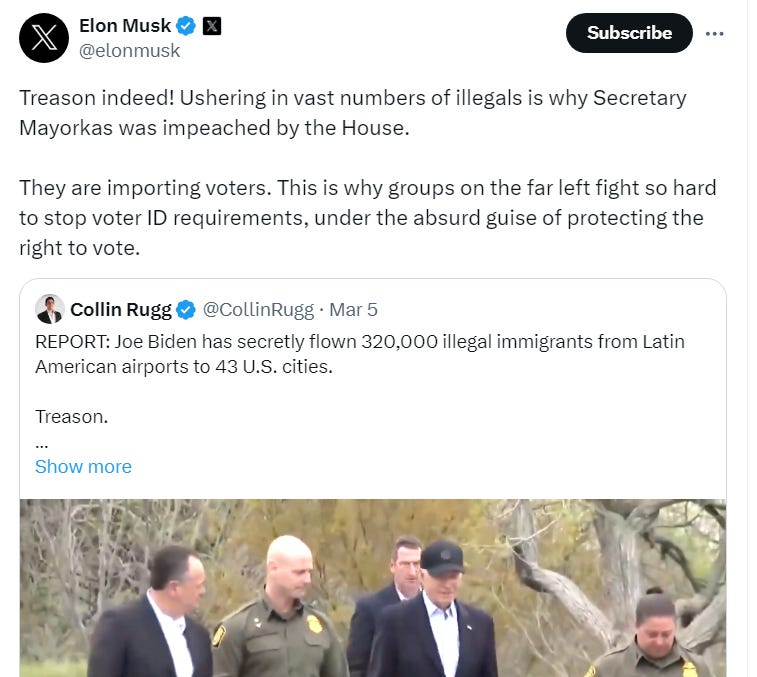 “America will fall if it tries to absorb the world,” Mr. Musk posted on X on Tuesday. Earlier in the day, he posted that the Biden administration’s immigration policies amounted to “treason.”