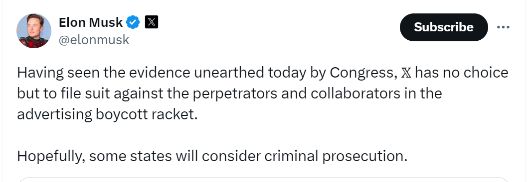 Having seen the evidence unearthed today by Congress, 𝕏 has no choice but to file suit against the perpetrators and collaborators in the advertising boycott racket. Hopefully, some states will consider criminal prosecution.
