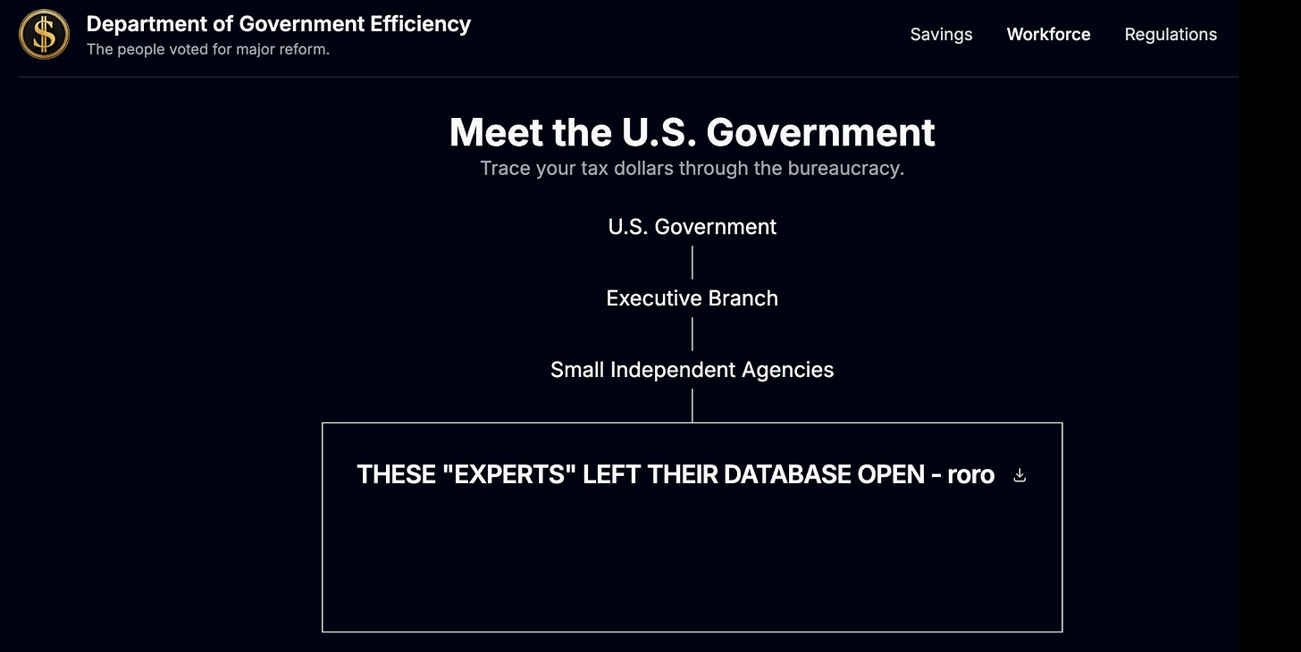 And DOGE itself might not even know, because look how sloppy these fucks are. Last week DOGE’s own site got hacked, and messages from the hackers stayed up for almost an entire day: “this is a joke of a .gov site” and “THESE ‘EXPERTS’ LEFT THEIR DATABASE OPEN -roro.” Now in the place where the hackers’ messages were is a link that lets you download an empty spreadsheet.