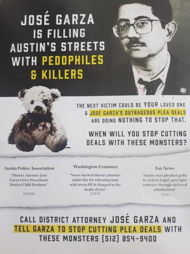 “José Garza is filling Austin’s streets with pedophiles & killers,” the flier said. “The next victim could be your loved one.”
