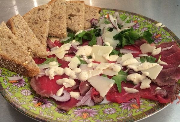 See, here's the thing: this is a decadent, luxuriant dish, usually an appetizer, although I find it to be a wonderful light lunch. The idea is to build as deep a flavor profile as you possibly can. This way, you have a thin edge with the smoky goodness of well-seared beef, then a deeper layer of marinated marvelousness, and a center with the wonderful mouthfeel and taste of extraordinarily tender, high grade raw beef.