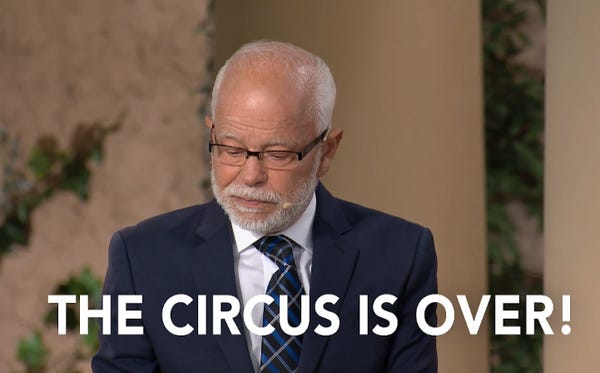 Send in the clowns -- and tell them to start preparing the fallout shelters, because Jim Bakker has it on authority from G-O-D himself that the world is ending very, very soon. And that one of the signs of this impending apocalypse is the end of the Ringling Brothers & Barnum & Bailey Circus.