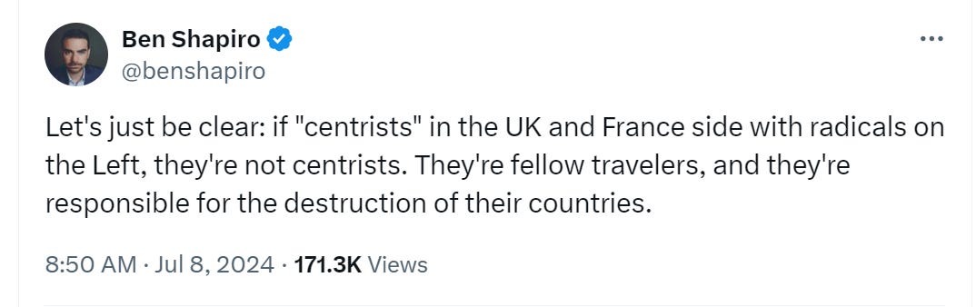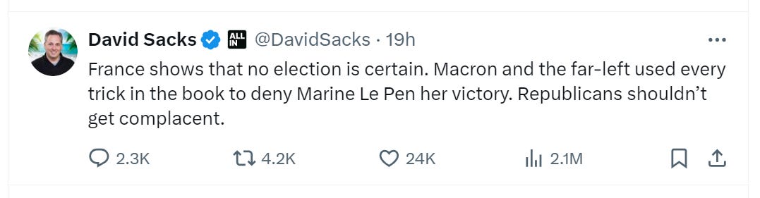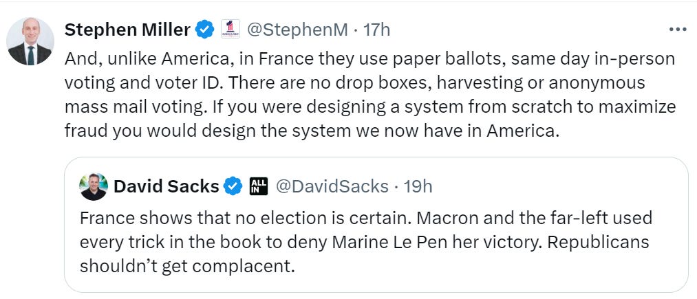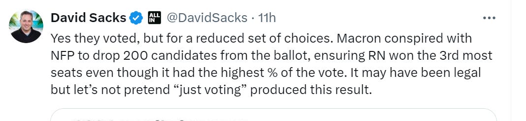 Perhaps the best talking point on this was that second tweet, which we saw mentioned elsewhere. It goes something like this: because the National Party got a larger percentage of the vote (37 percent) than either the left (26 percent) or centrist (23 percent ) coalitions got individually, somehow this means that the French people really wanted a right-wing government, but were thwarted by … a majority of the public that didn’t? We think we’ve got that right.