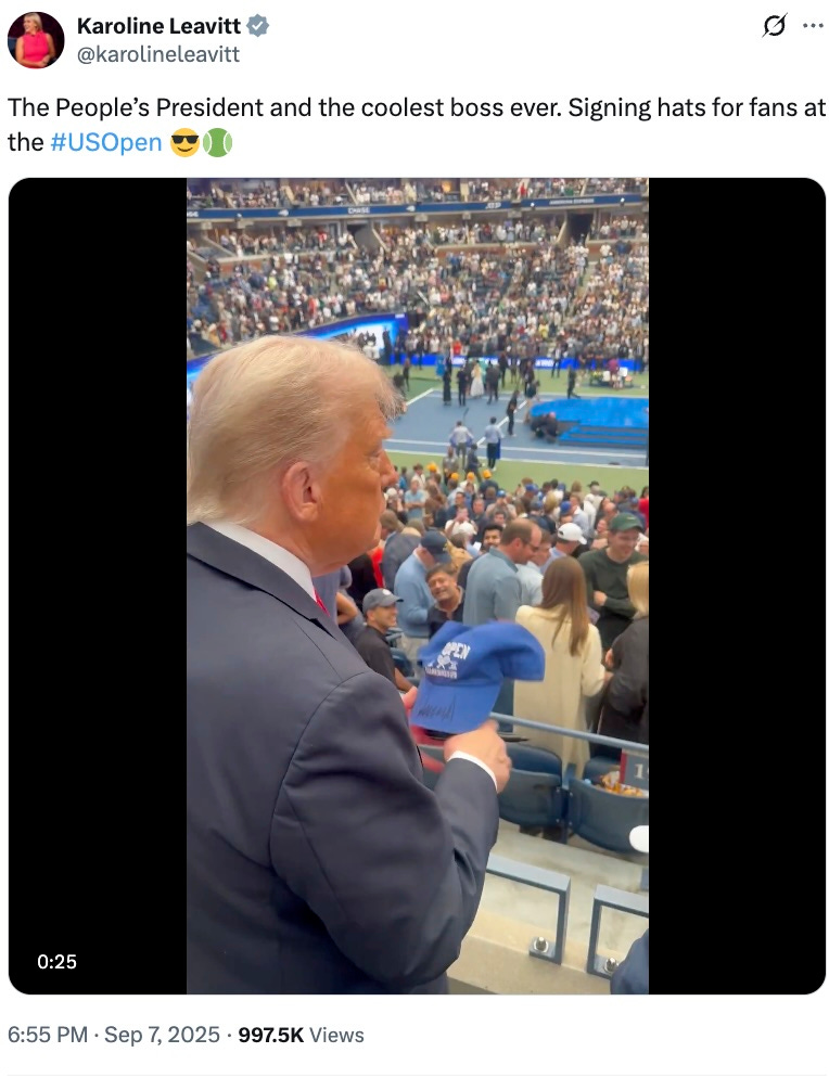 Anyway, naturally spackled spokes-face Karoline Leavitt gushed about what a man of the people Trump was for signing hats and throwing them into the crowd. “The People’s President and the coolest boss ever. Signing hats for fans at the #USOpen.”