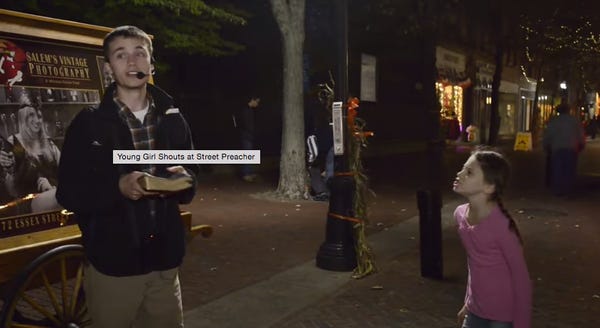 Apparently, street preachers blah blah blahing on Halloween is something of an annual tradition in the town of Salem, Massachusetts, because Halloween is bad and evil and wrong. Or it originally belonged to Jesus and must be seized back from the pagans who stole it, according to Kirk Cameron. Either way, it's apparently a good time to get your preach on -- and a time when the locals probably get pretty sick and tired of hearing it. So you this kid's just saying what they're all thinking.
