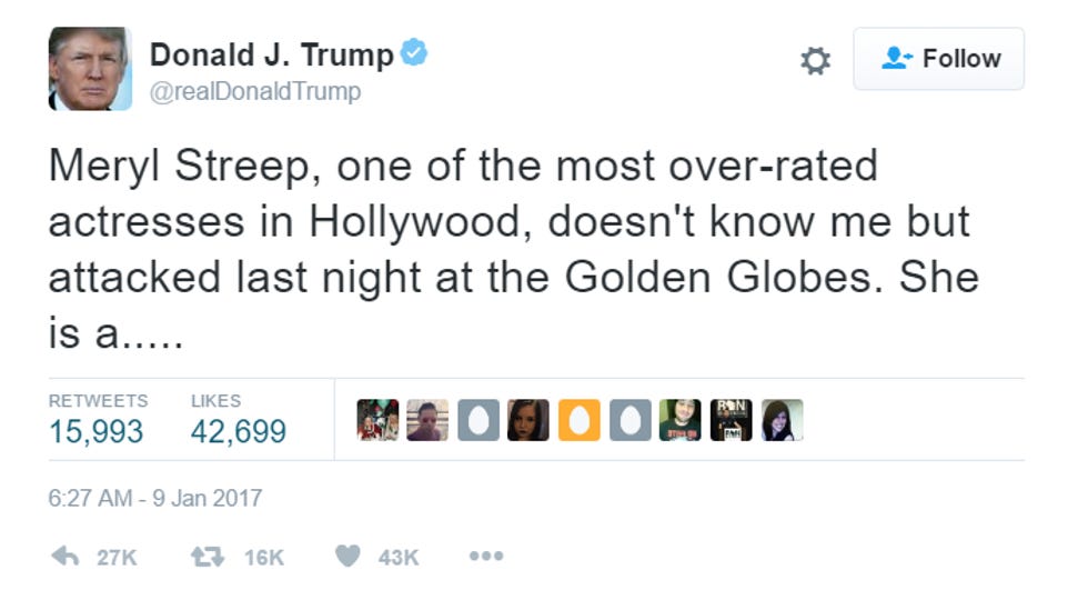 As we watched, we said to ourselves, "Oh, I DARE A MOFO to get on Twitter and call Meryl Effing Streep OVER-RATED." And because Donald Trump is a thin-skinned man-baby who takes dares Wonkette says in our brain, he delivered: