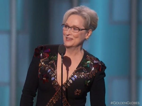 As we ate our liberal elitist Thai food at our neighborhood Thai watering hole Sunday night, we watched as Viola Davis presented the Cecil B. Demille award to Meryl Streep, America's greatest living actress, on the Golden Globes. Streep had lost her voice, but she made a speech anyway, and instead of thanking her agent and her hamster and Jesus, she decided to talk about the Hollywood Foreign Press, the "Hollywood" part and the "Foreign" part, and the "Press" part. And she utterly defenestrated, eviscerated, and fucked right up that grotesque orange asshole a solid minority of Americans voted to elect in November, without even once saying his name.