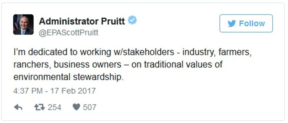Pruitt didn’t mention public health once in his first speech to agency employees, instead focusing on improving the EPA’s relationship with private interests. In a tweet after his speech, Pruitt said he was committed to working with several types of “stakeholders” on environmental stewardship. He did not mention environmentalists as one of those stakeholders.