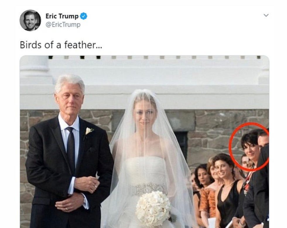 Eric Trump, the president's second worst son, tweeted a photo of Clinton walking his daughter, Chelsea, down the aisle at her 2010 wedding. Pictured among the guests was someone who looked like Maxwell. (I can't confirm the actual guest list. I know she didn't invite me .) Trump grossly commented, “Birds of a feather ..."