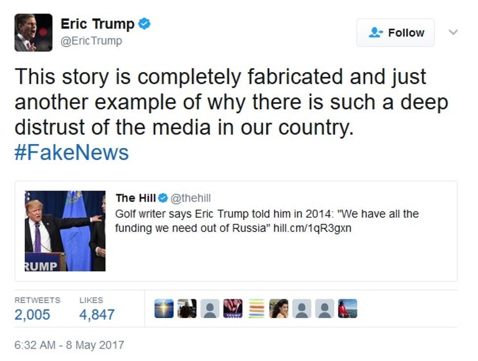 Strangely, Eric didn't also send out a Tweet yelling at his brother Donnie for saying in 2008, “Russians make up a pretty disproportionate cross-section of a lot of our assets. We see a lot of money pouring in from Russia.” Then again, Don Jr. never called the old man an asshole. Eric Trump also told the New York Post the story was "complete garbage" and "We have zero ties to Russian investors," which makes it true.