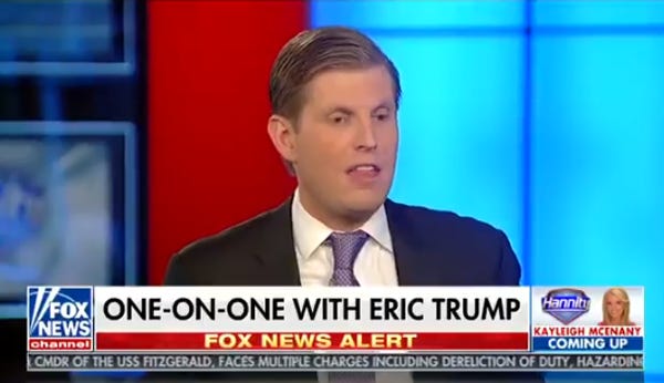 Here's the one where Eric says "the media" has low approval ratings, unlike Daddy, who has ... well never mind, THE MEDIA SUCKS! Also, Eric Trump says CNN's ratings are "ZERO," which is ... not how ratings work.