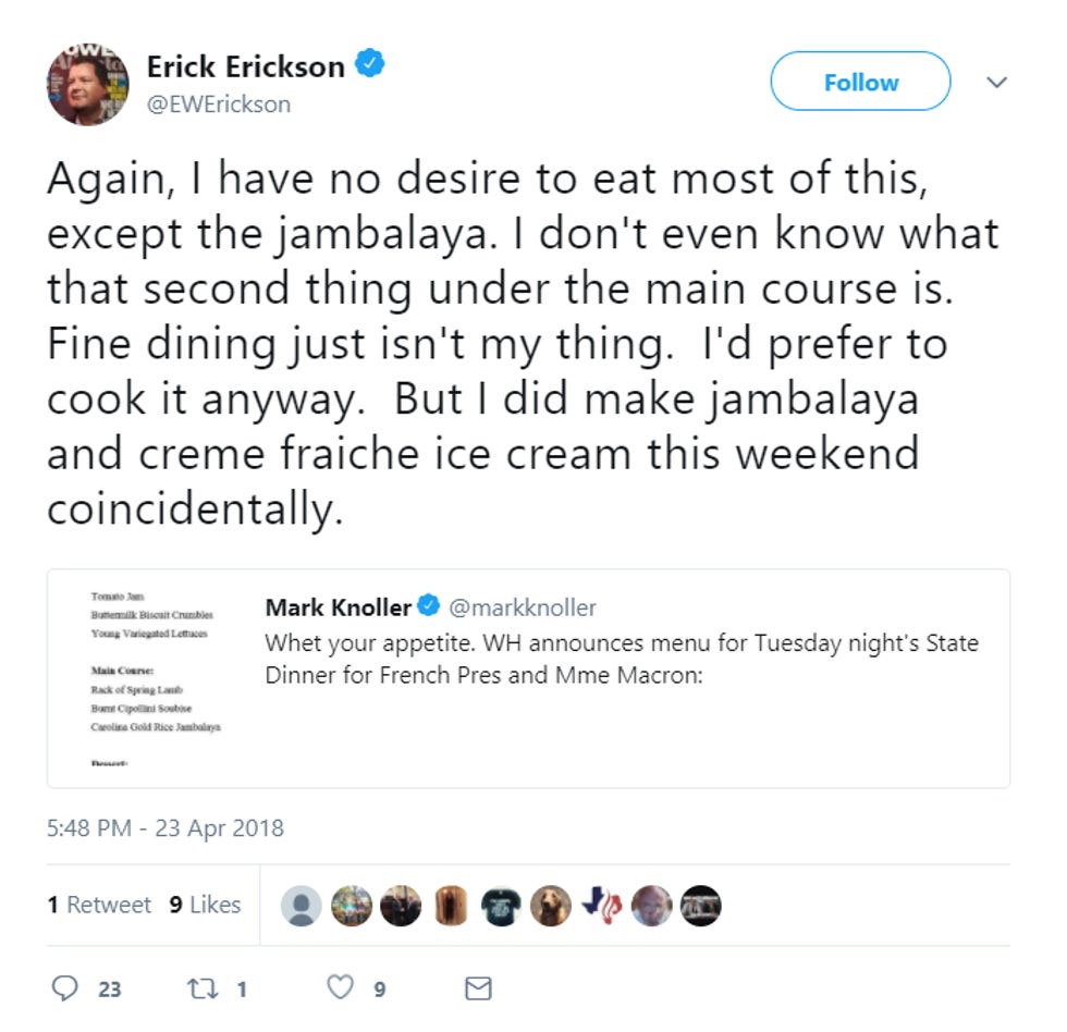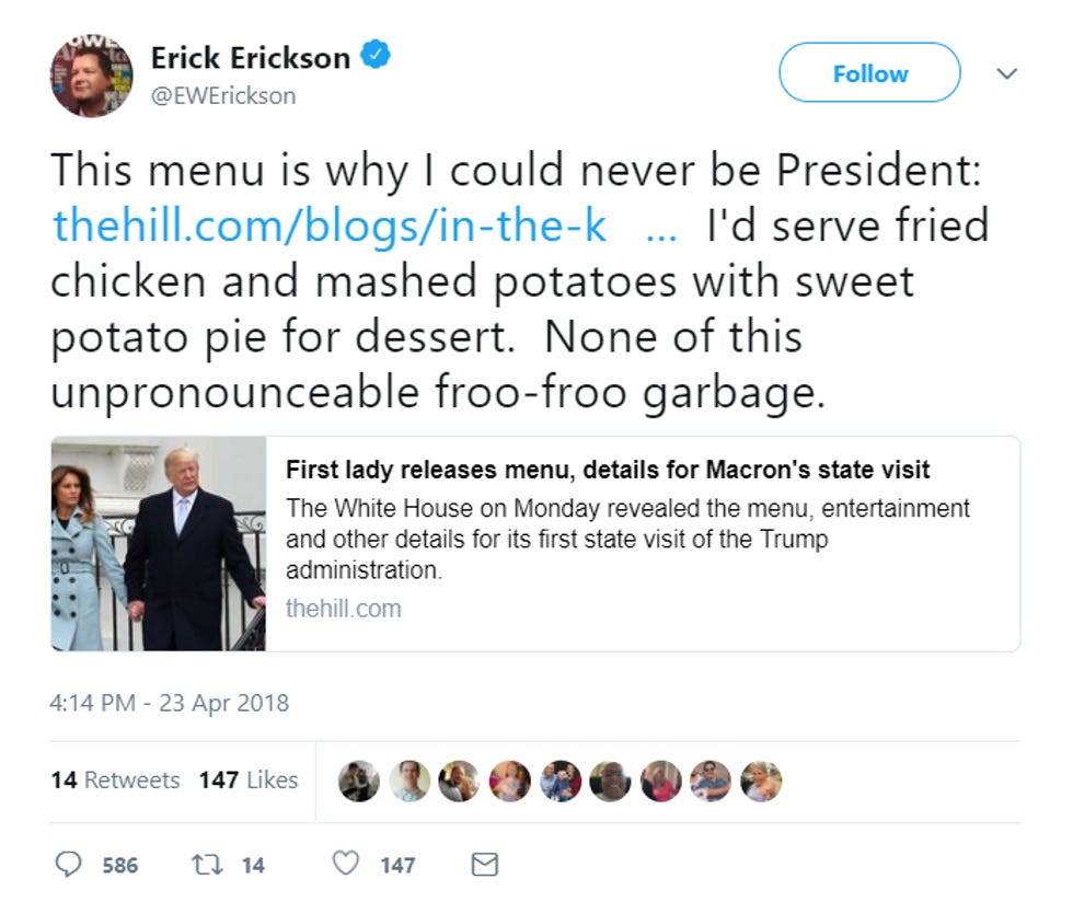 Wingnut "thinker" Erick Erickson is doing that thing where, though he doesn't like Donald Trump, he's trying to prove he is jes' folks, a salt-of-the-earth walking heart attack who lives in Macon, Georgia, and is simply not interested in your fancy East Coast Beltway values from San Francisco. Particularly, he ain't understand the fancy-ass French food being served at tonight's White House state dinner with Crown Prince Sexxxy of France, Emmanuel Macron: