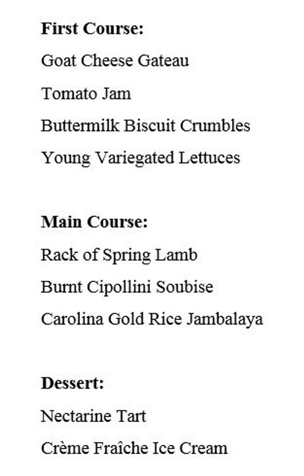 The menu will consist of three courses, which will include American dishes with French influences. The main course will be a rack of spring lamb with Carolina gold rice jambalaya.