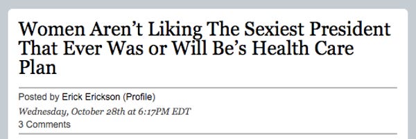 Oh hey girlfriends! Erick Erickson is so confused because how do all the gals, all of them, not love Obama's health care plan when Obama himself is such a dreamboat? It's weird right? Ha ha, it's like, unless we're like a bunch of lesbians we should be on board with this thing automatically. It's called biology, and it's a science—or so the boys tell us! [ RedState ]