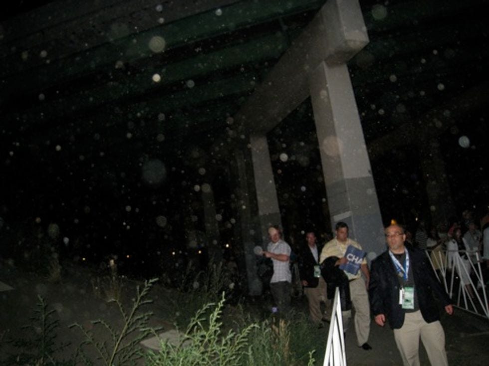So after the four hours of sunstroke and no wireless and some enthusiastic dog-whistler deafening everyone in a 30-foot perimeter of his terrifying noises, we emerged from Invesco Field and began the four hundred-mile journey on foot through Mordor. This was seriously the most complicated, arduous exit from a public venue since a half-million people stampeded out of Wolf Blitzer's live sex show at the Republican National Convention in 1996. Follow us on a perilous journey past Jersey barriers, under abandoned bridges, through hobo encampments, and into the darkest reaches of the American id.