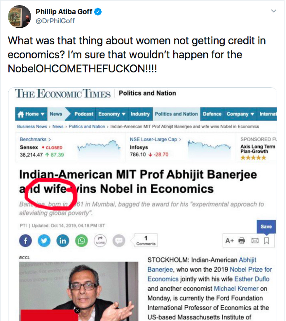 You'd think newspapers would know enough by now to stop diminishing a woman's contributions to society just because she married a man. If they weren't a couple, the headline couldn't very well read Abhijit Banerjee And Chick Who's Not His Wife (But He's Working On That Shit) Win Nobel Prize .