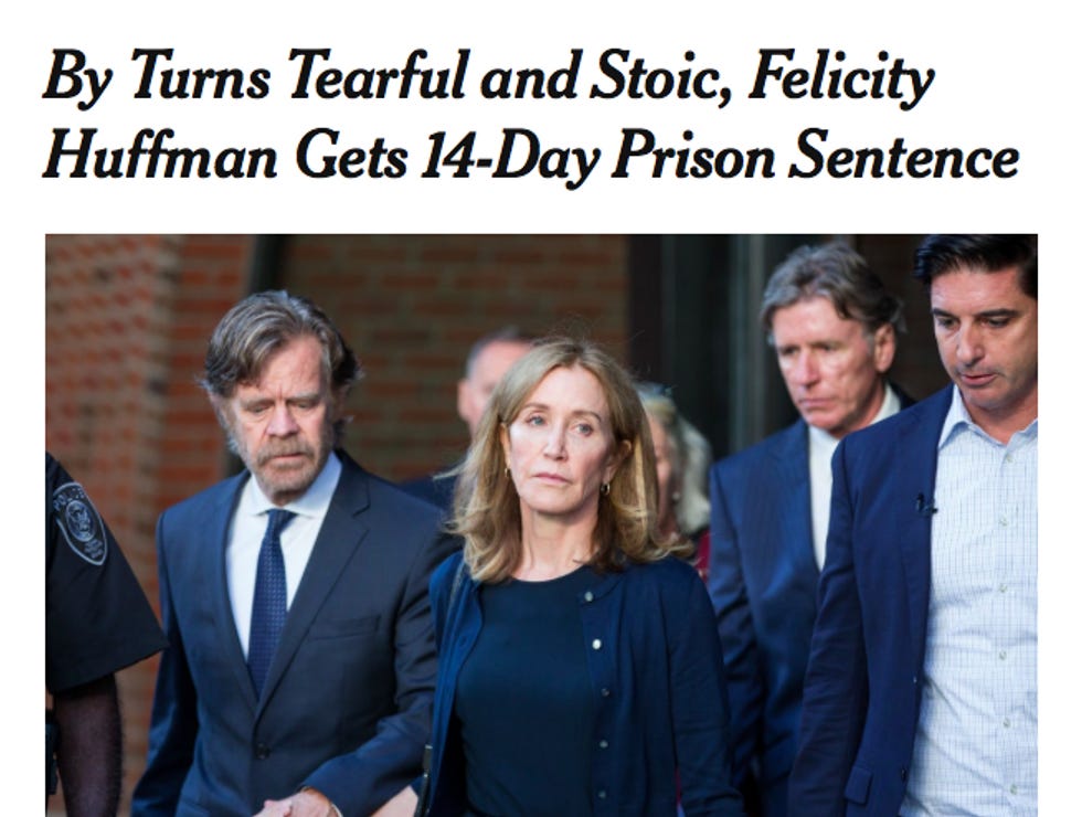William H. Macy is literally in the photo with Felicity Huffman, and he's not just her side dick. She was busted for a crime directly involving their child. If I were Huffman's manager, I'd beg the New York Times for this headline: " Fargo" Star William H. Macy's Wife, Also An Actor, Gets 14-Day Prison Sentence.