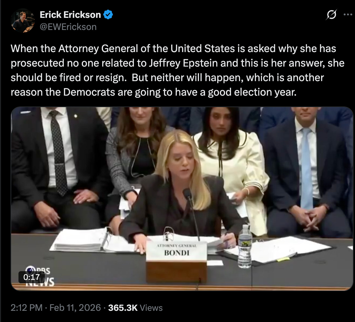 White supremacist Nazi virgin Nick Fuentes was already calling for Bondi’s head even before this. The Daily Beast reports that on February 9, on his Rumble show, he said, “Pam Bondi needs to be impeached. You lied about the existence of the files. You lied about unindicted collaborators and accomplices.”