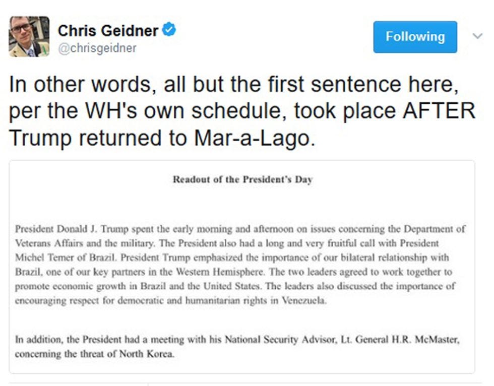 So that sounds like a really busy day! In the early morning and the afternoon, he fixed the V.A. (having canceled a "major meeting" on the subject he had plucked right from his bottom the day before) talked to the president of Brazil, and met with his National Security Adviser to talk about North Korea. That was one full early morning and afternoon! Except, as Geidner notes, you get a completely different impression of Trump's "work" day if you actually look at reports from the print reporter on press pool duty that day, Ben Kamisar of The Hill, who was not actually following the president much of the day, but stranded at the West Palm Beach Library .