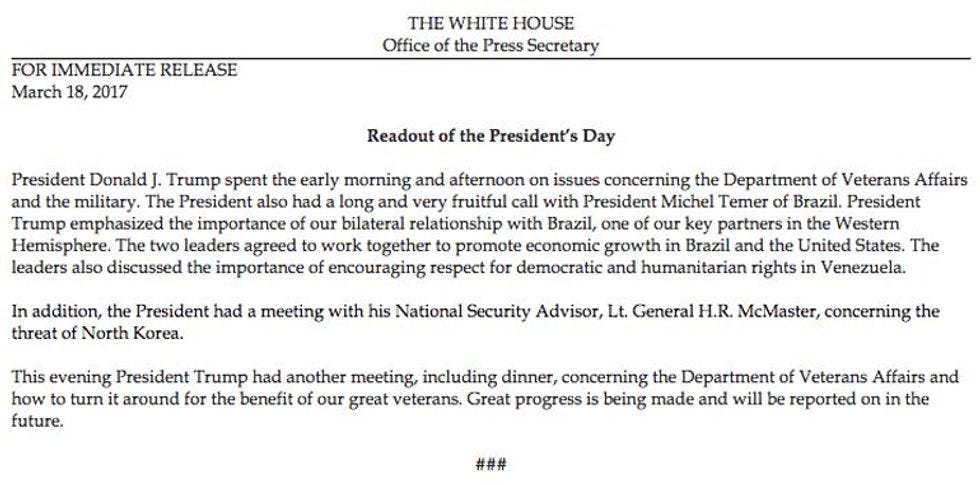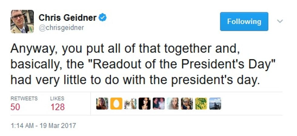 Here's the subject of Geidner's ire: a release called a "Readout of the President's Day," in this case, for Saturday, March 18. Geidner cautiouslysays the release of these little pseudo-summaries of Donald Trump's schedule "feels like a not-good development." In part, it's the very use of the term "readout," a term of art which in the past has always referred to a very specific thing: