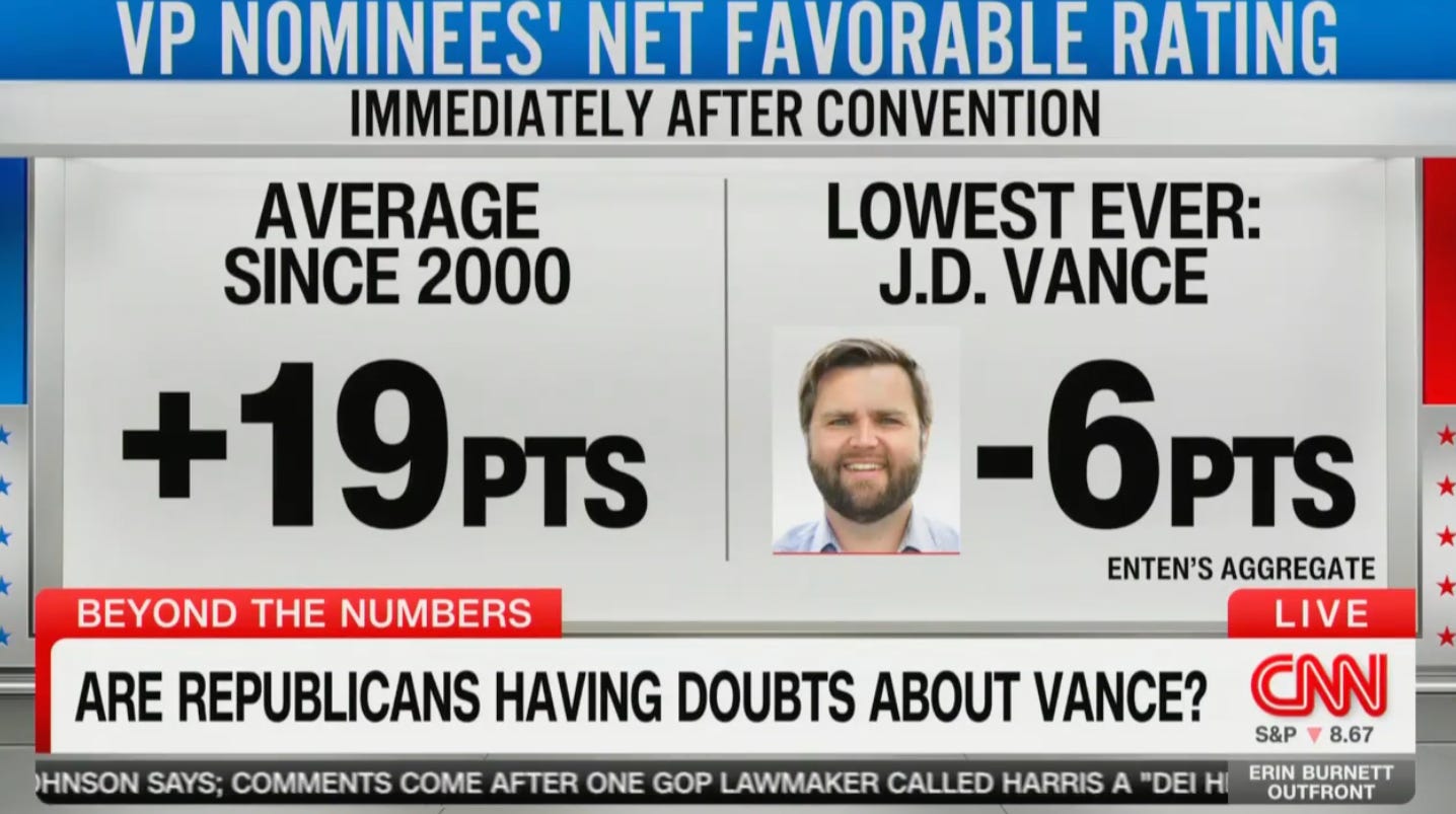 “He is the first guy after, immediately following a convention, a VP pick, who actually had a net negative favorable rating that is underwater,” he went on. “The average since 2000 is plus 19 points, JD Vance, making history in the completely wrong way.”