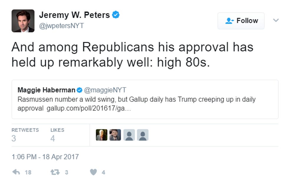 It's true that in the Quinnipiac poll, Trump has an 87% approval rating among dumbass Republicans. It's not really true that Trump is moving much in Gallup's daily tracking poll. But woo hoo, let's get SO 'SCITED that a president whose popularity hovers somewhere between dick cheese and anal fissures has the approval of most Republicans. We guess they're the only Real Americans who matter, right?