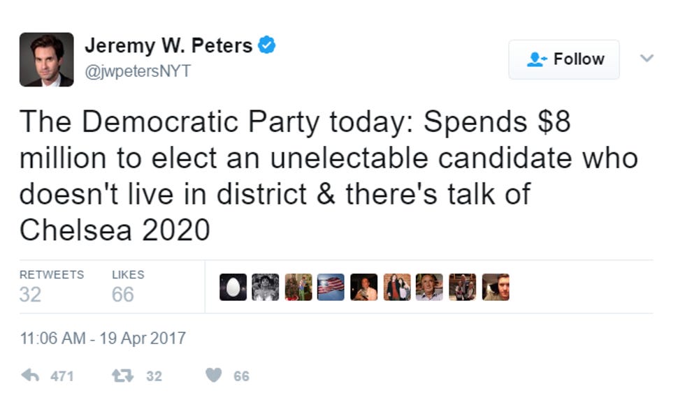 Oh fuck you, you flaming fuck tentacle from the outer rings of hell. Jon Ossoff lives just outside his district, because he and his girlfriend moved there so she could GO TO SCHOOL, which is apparently something Jeremy Peters needs to do. Ossoff grew up in the district, and he said if he wins, he's a-movin' right back.