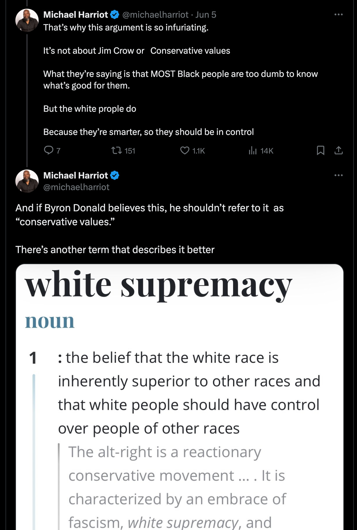 Finish by reading this excellent thread from Black writer Michael Harriot, who painstakingly details what Jim Crow was really about, how Black people were better off in exactly zero ways, and why Donalds is just shilling for white supremacists who believe “Black people are too dumb to know what’s good for them.”