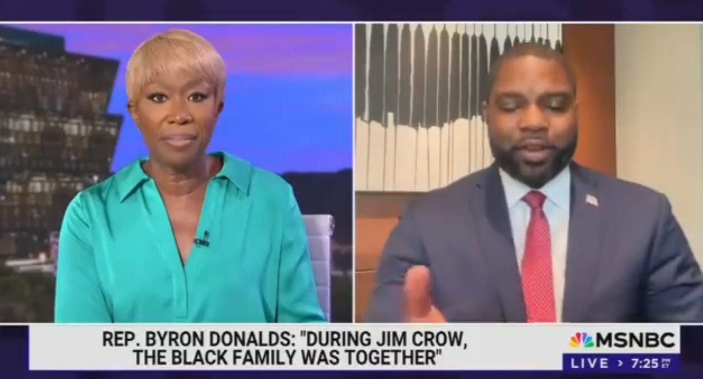 On Joy Reid’s show last night, Donalds just screamed a lot, but she didn’t care. When he bitched and moaned about people saying he was being “nostalgic” for Jim Crow, she noted it was he who brought up Jim Crow “three times for emphasis.”