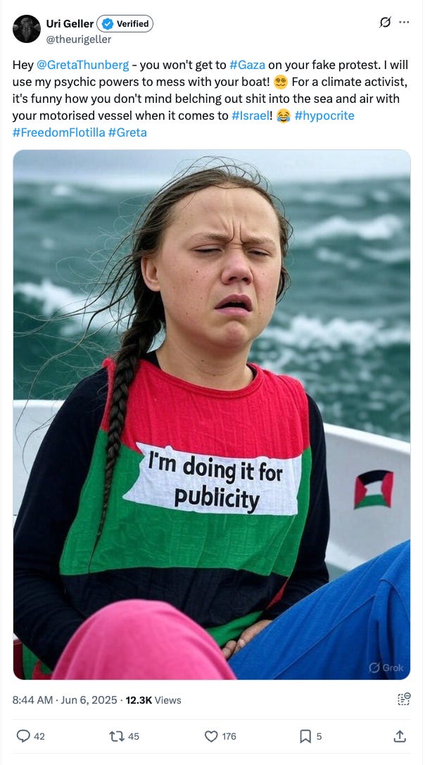 “I stopped the navigation systems of the ship,” Geller told the Jerusalem Post. Geller, an Israeli native who, again, cannot fucking bend spoons with his mind, had posted on Xitter on Friday that he would use his “psychic powers” to mess with her boat, along with a picture of Thunberg in a shirt photoshopped to say “I’m doing it for the publicity.”