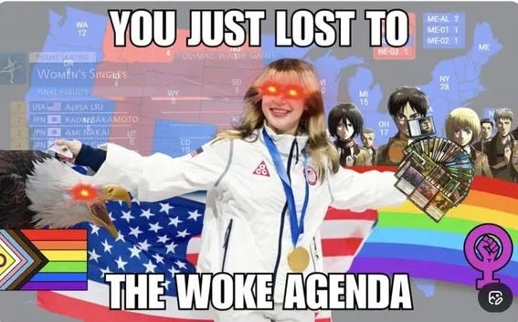 Unlike certain other losers and professional complainers of the Riley Gaines variety, woke don’t choke! We’re still fleshing out the bumper sticker in committee.